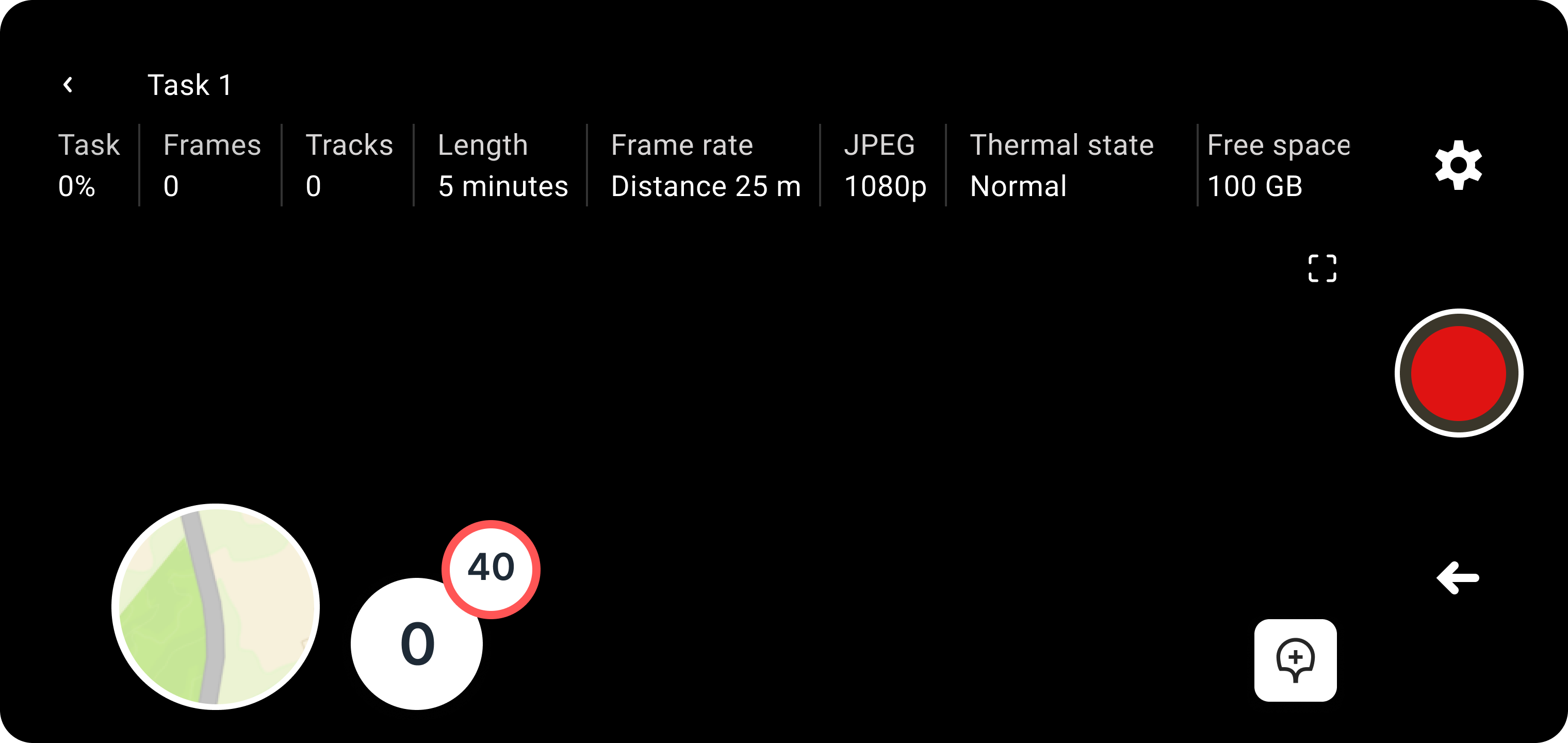 - Frames: number of frames (images bound to geographic coordinates) captured by the application and not yet uploaded for processing. When you record a video, frames are captured automatically depending on the configured frequency.