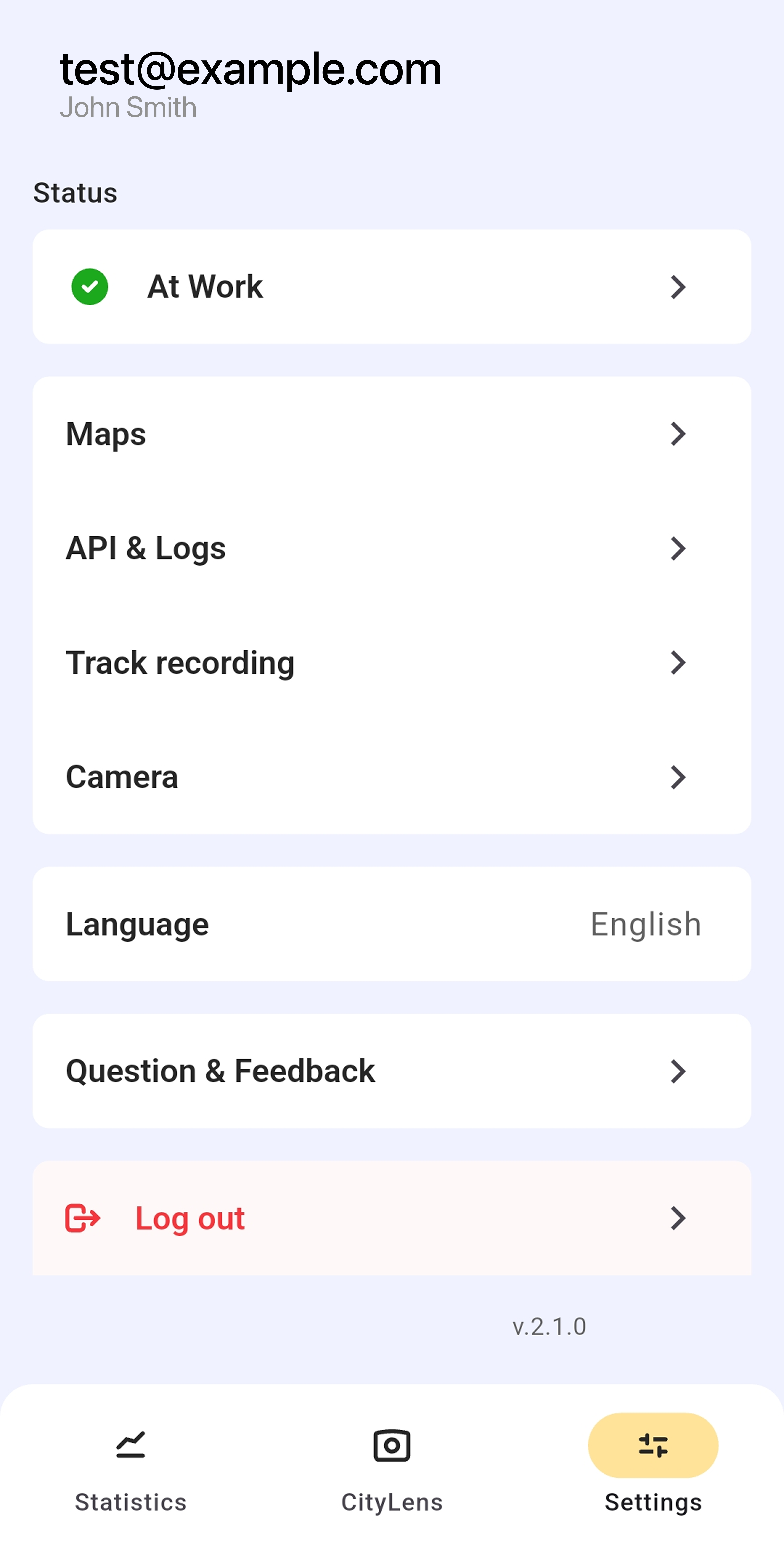 - CityLens tab where you can start recording in one of the modes or upload recorded tracks. For details, see the Recording data instruction.