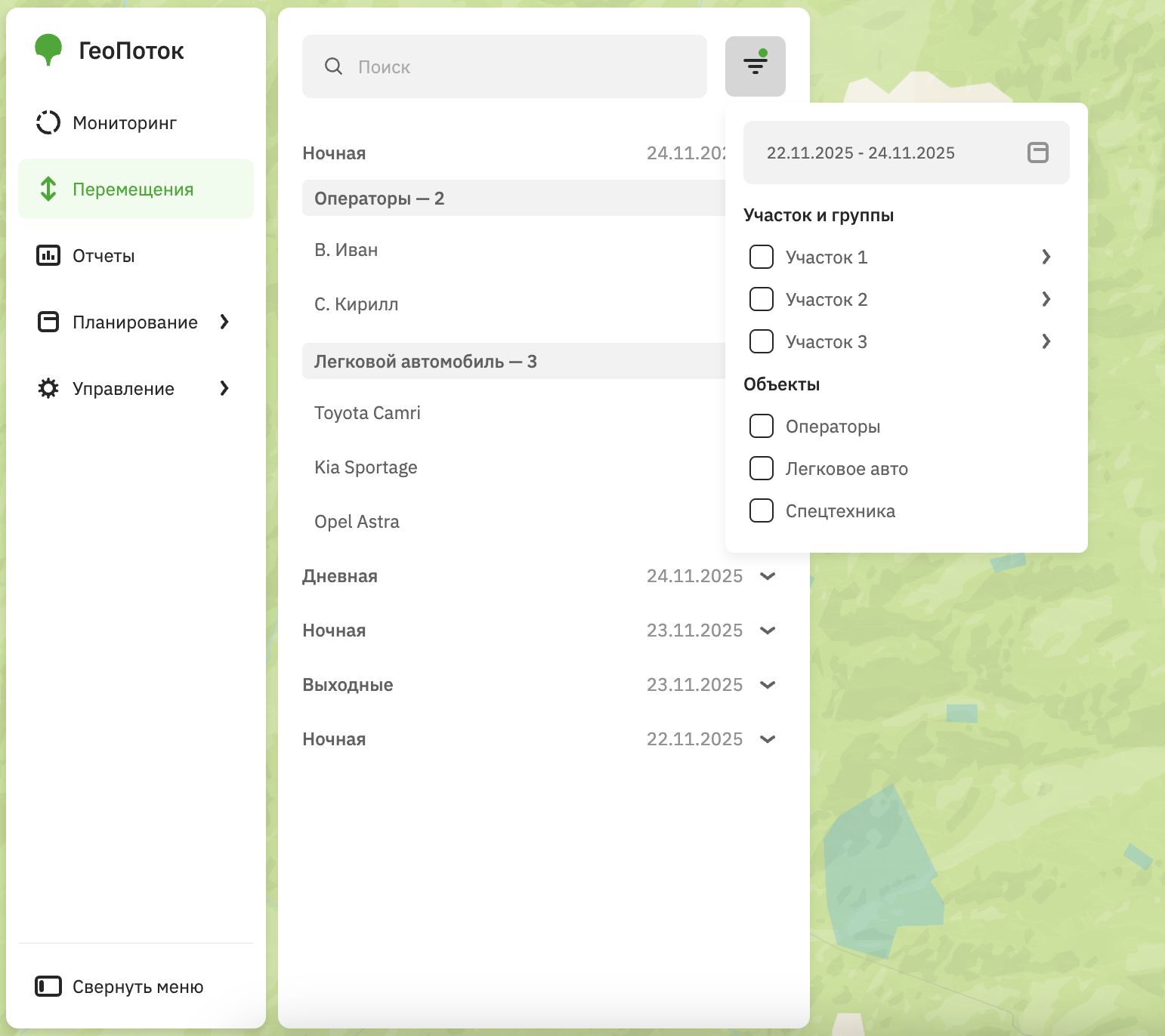 The movement history allows you to evaluate the activity of employees and transport during the shift, identify deviations from the plan, and analyze incidents.