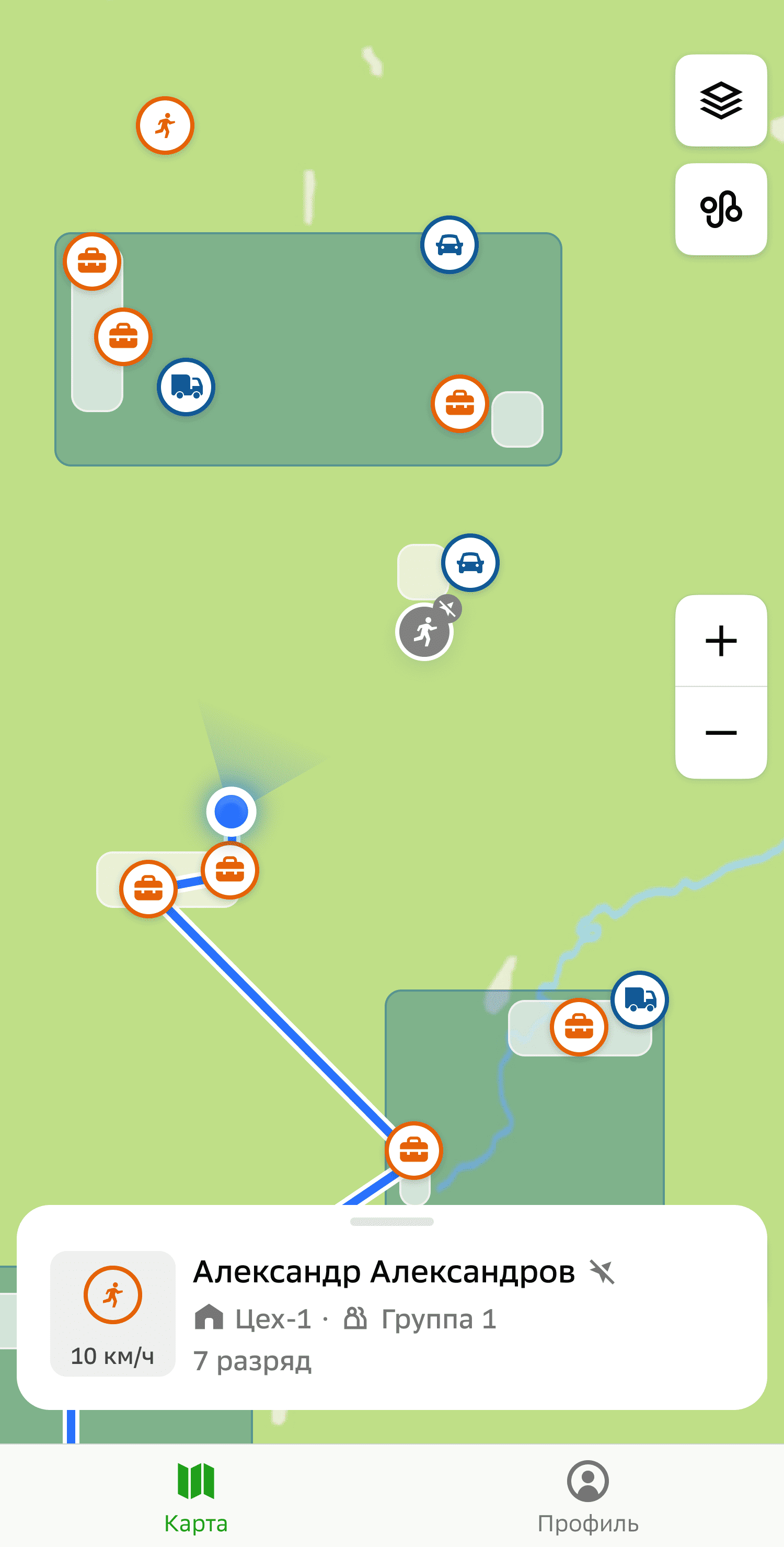 The 2GIS GeoFlow mobile application allows employees to view the map and information about infrastructure objects. The mobile application also records data about employee movements within the organization territory during a shift. This data allows administrators (dispatchers) to track employee movements in real time and analyze movement history in the administrator web panel (see the Administrator guide).