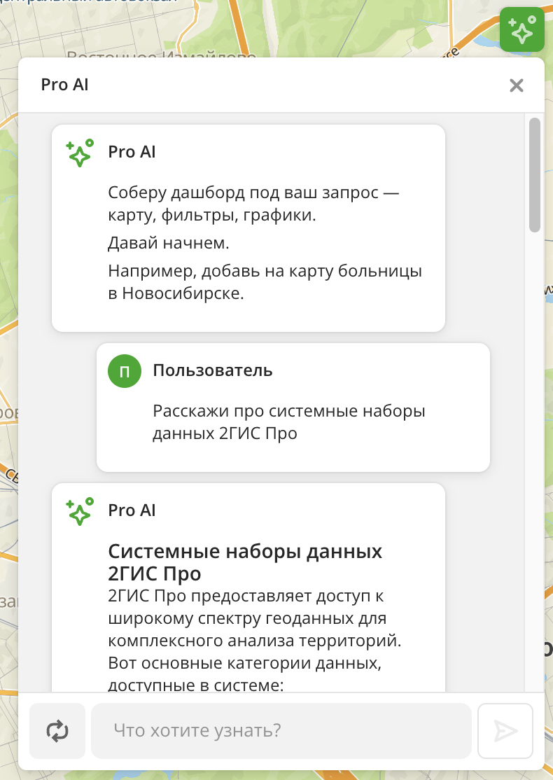 - Информация о системных данных. Получайте справку по любому системному набору данных 2ГИС Про. Пример запроса: «Расскажи про системные наборы данных 2ГИС Про».