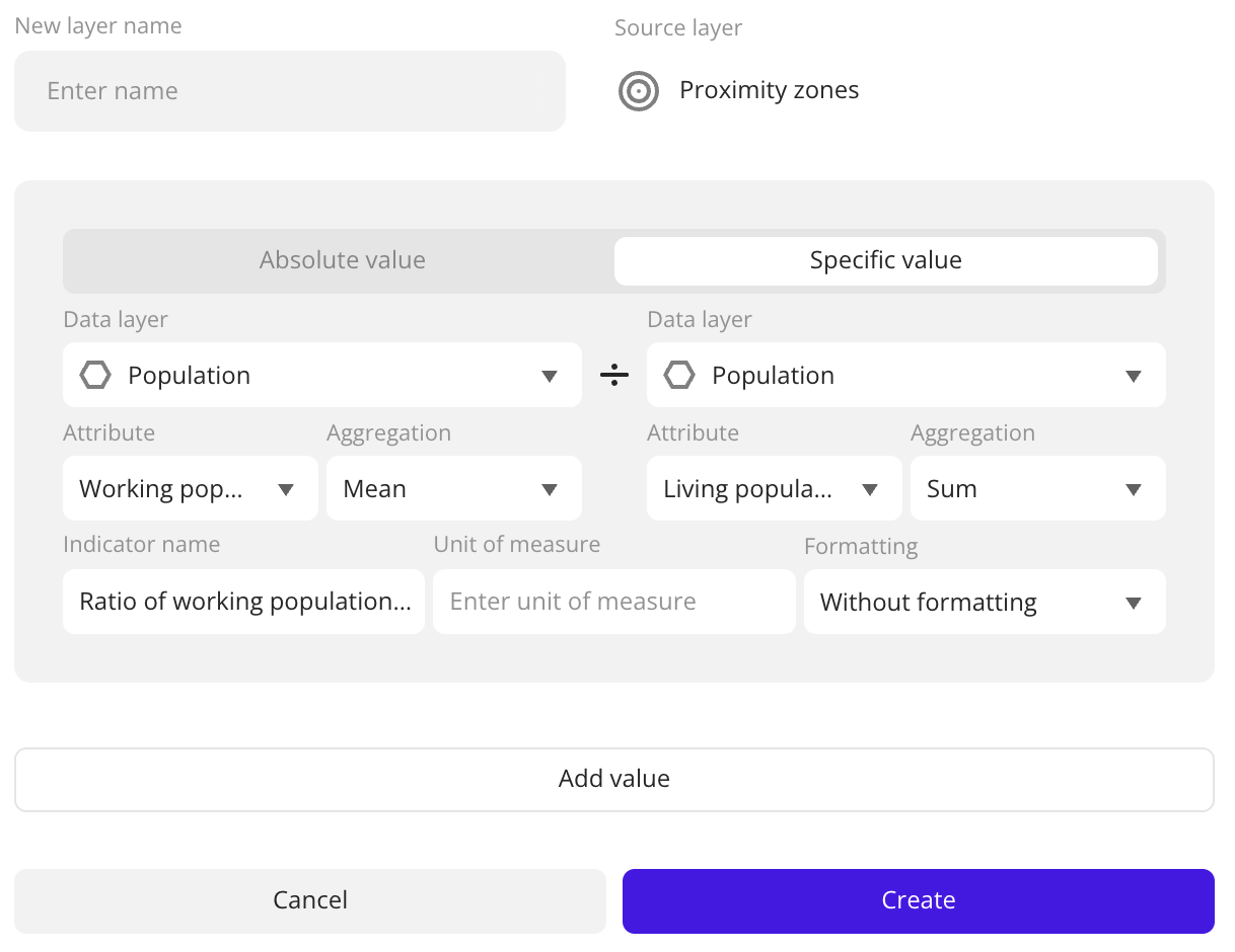 - Absolute value: sum, average, minimum value, maximum value, and others. Usage example: calculate the total count of residents or the average rating of competitors within a polygon or a 5-minute proximity zone.